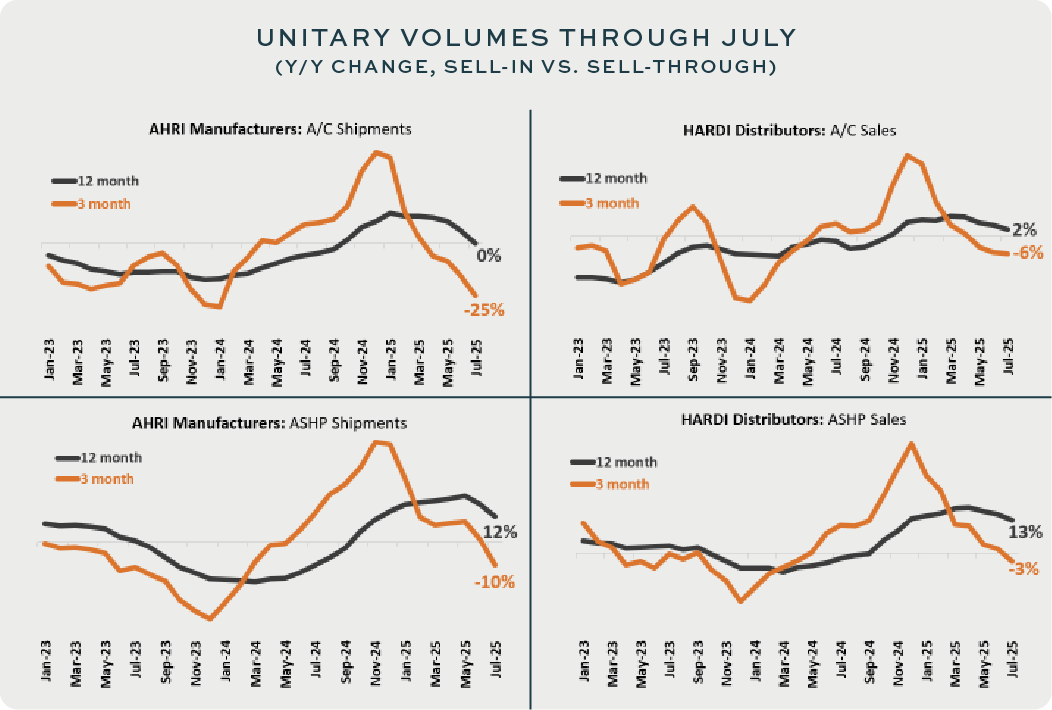 In the 3 months through July, distributor sales of air-conditioners and air-source heat pumps have declined 6 percent and 3 percent, respectively, from their 2024 levels. While these recent distributor sales trends are disappointing, they remain at a higher level than the trends we see more recently from manufacturers. Through July, manufacturer shipments of air conditioners and heat pumps are down 25 percent and 10 percent, respectively from their 2024 levels. Distributor inventory growth – up 13 percent Y/Y in July – is weighing on order volumes, and 2024 shipment comparisons will get progressively more challenging due to the strong shipment growth manufacturers experienced in the back-half of 2024.